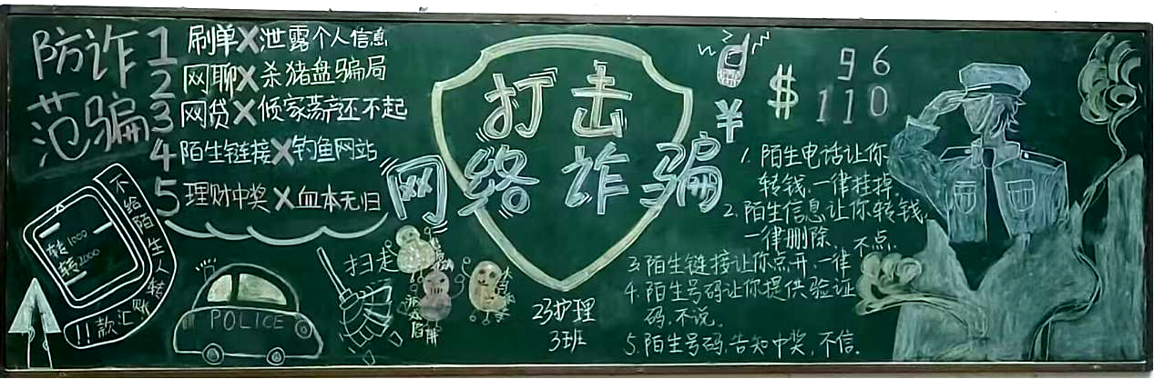 本次黑板报活动中,各班级同学积极参与,紧扣本次“反诈”主题,通过多种元素、绘画材料呈现出精彩的黑板报作品。展现了同学们防范诈骗的意识和方法。
