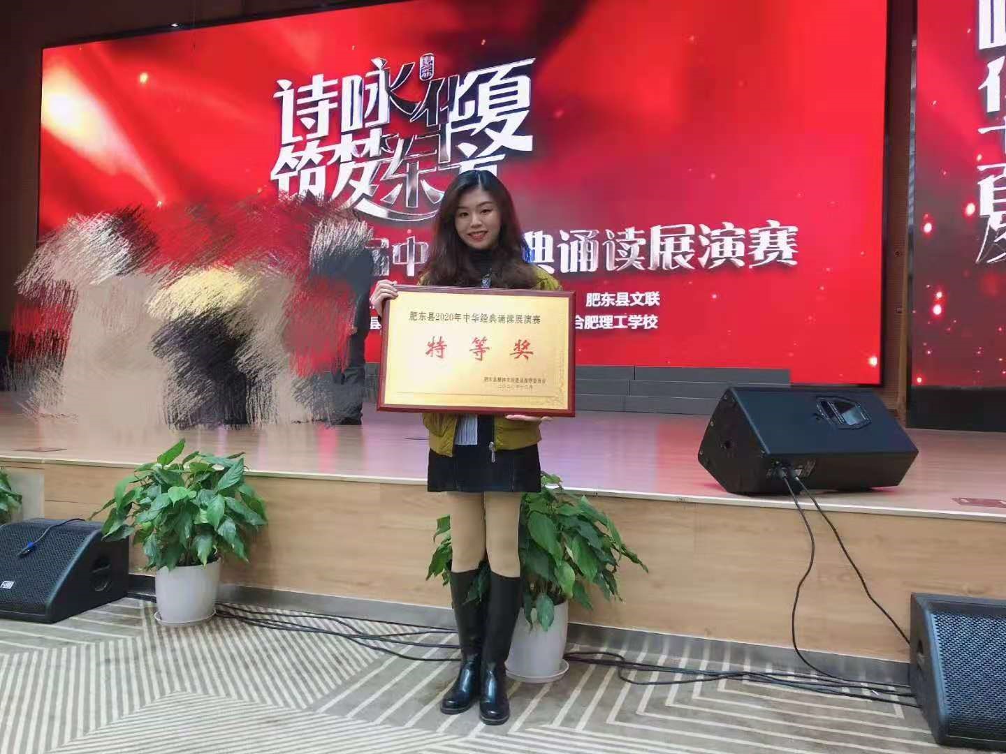 深入贯彻党的十九届五中全会精神,增强家国情怀,由肥东县委主办的2020年肥东县第九届中华经典诵读比赛,在合肥理工学校学术报告厅隆重举行。由我校校企联合培养19医检肥东教学班7名同学、部分实习同学和医院方工作人员共同组建的参赛队,代表教学医院安徽医科大学第一附属医院东区(肥东县人民医院)参加比赛,经过激烈角逐,最终荣获本次比赛特等奖,胡蒙蒙同学作为主诵人员,表现突出、得到院方领导和老师们的充分赞扬和肯定。