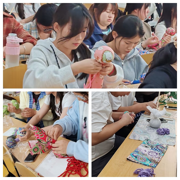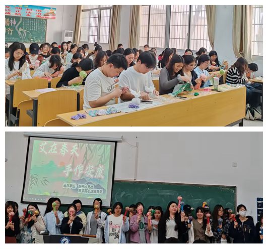活动以“艾在春天·手作安康”为主题,通过“视听体验”、“手工实践”和“知识互动”等环节展开。开场播放的《艾草的前世今生》文化短片,以生动的影像展现艾草从《诗经》记载到现代药理应用的文化脉络。结合中医“未病先防”理念,让同学们深入了解艾草温经通络、祛湿散寒的养生功效,以及艾草锤的穴位按摩手法。在手工制作环节,同学们将晒制艾绒、棉麻布料、天然麻绳等材料巧妙组合。随着教室里弥漫开艾草特有的清香,五颜六色的艾草锤在同学们手中逐渐成型。活动还设置了中医药文化知识竞答环节,通过“艾草最佳的采收时节”“《本草纲目》记载的艾灸功效”等趣味问题,同学们在竞答中深化理论知识认知。