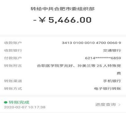 抗击新冠疫情期间,该院率先在全校开展特殊党费上缴工作,校党委书记罗兆好以普通党员身份和24名党员共捐款5466元;后期在学校组织的捐款中,19人共捐款2900元。