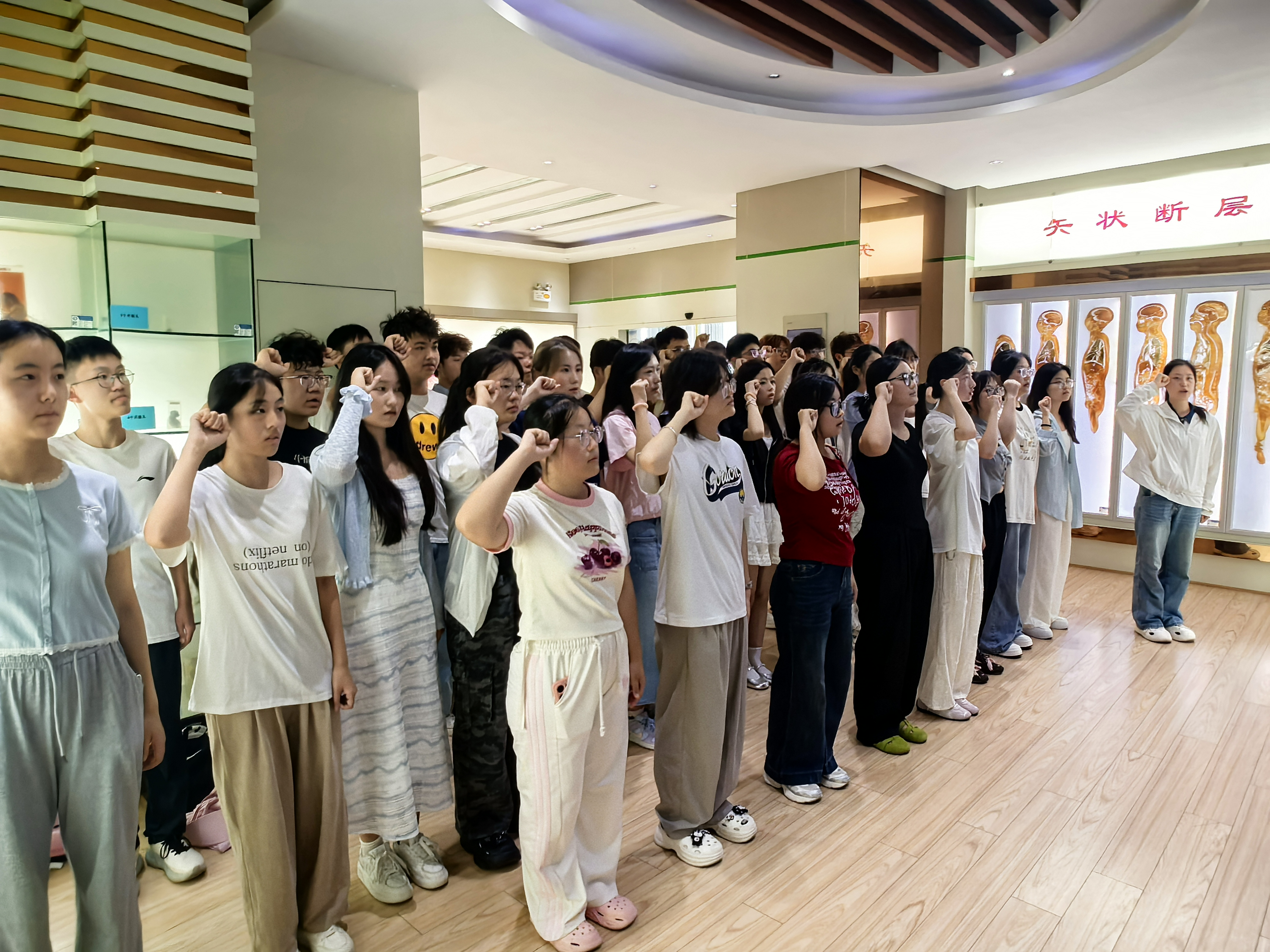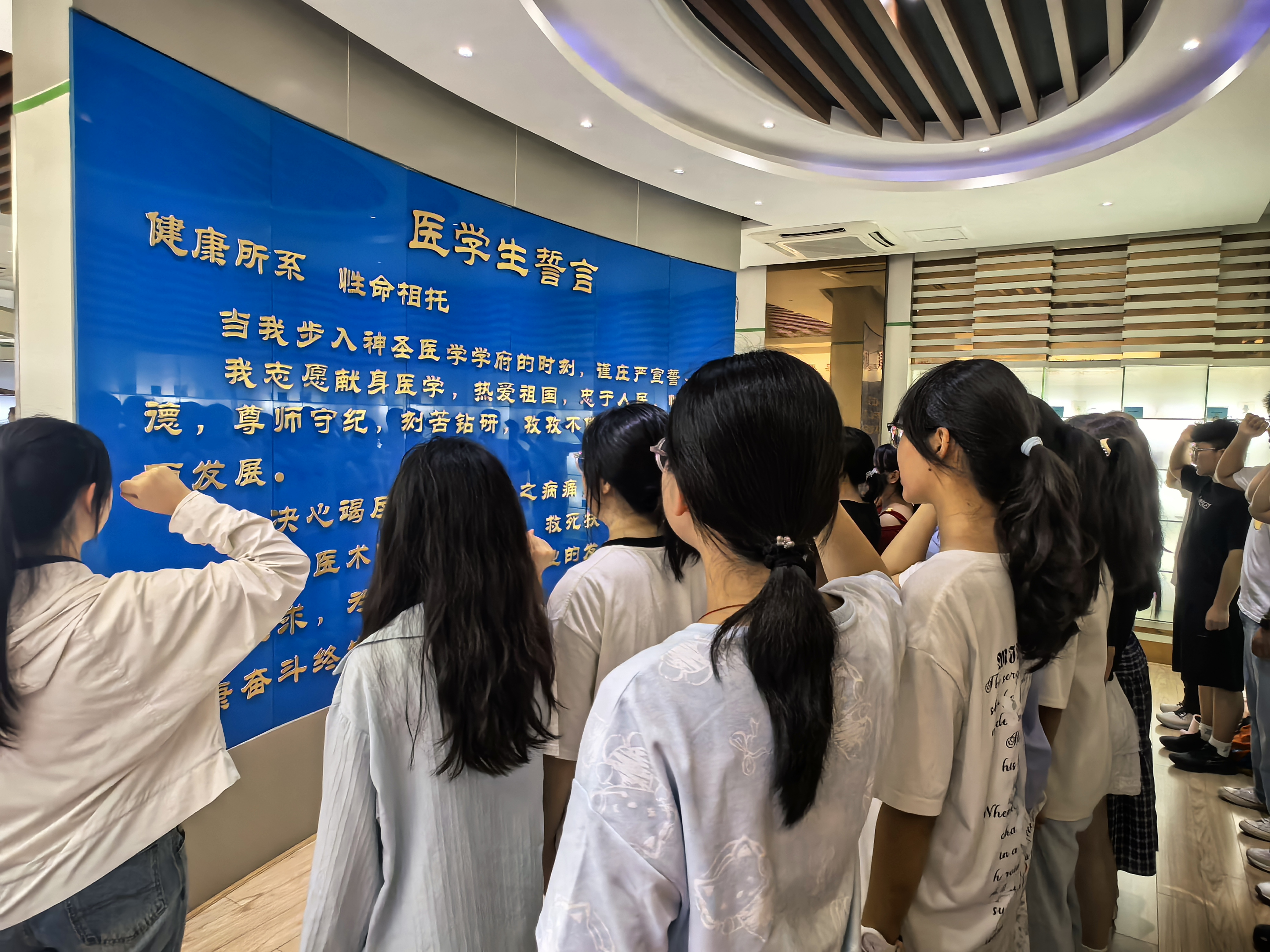 9月12日,430名在线观看日本www一区新生在资深教师夏传余的带领下,参观了生命科学馆。夏老师重点讲解了馆内珍藏的“大体标本”和胚胎发育系列展品,引导新生们感悟生命的崇高与医学的责任。在肃穆的氛围中,全体新生在宣誓墙前庄严举起右手,许下了“健康所系,性命相托”的医学誓言,标志着他们医学事业的正式启航。