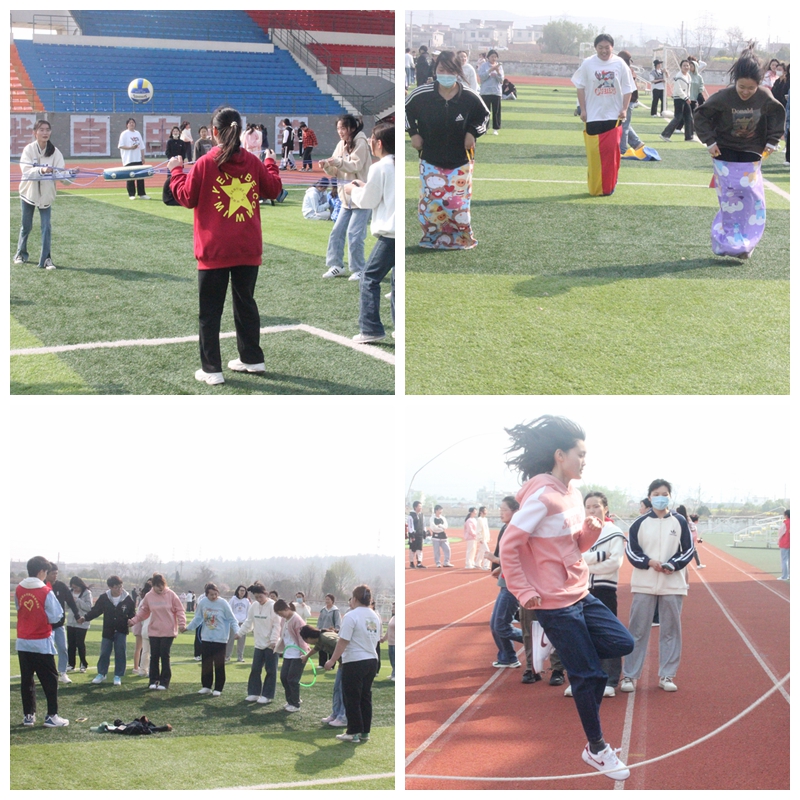 本次趣味心理运动会共设四个游戏环节:八字跳绳、击鼓颠球、欢乐袋鼠跳和手拉手套圈。简单有趣的比赛,伴着操场上的欢声笑语,点缀着合职生机盎然的春意。现场不时响起一阵阵加油呐喊声和欢呼声,每位同学的脸上都洋溢着快乐的笑容。
