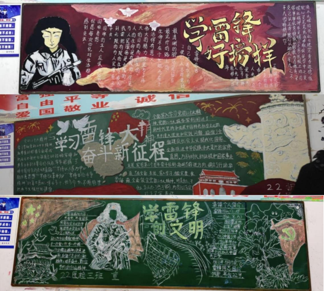主题板报我绘制,雷锋精神我传承。在团总支的号召下,各班级团支部积极组织绘制以“青春雷锋行,志愿暖人心”为主题的黑板报,同学们认真设计,细心书写,打造出具有班级特色的文化宣传阵地。经过评选,共十个班级获得本次板报展评的嘉奖与表彰。