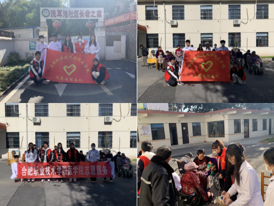 早上 8 点,志愿者们从合肥职业技术学院鼓山校区出发,经历了大约15分钟的车程,来到了洗耳池长者之家。一走进敬老院的大门,老人们已经在院子里面坐好,欢迎我们的志愿者。细心的志愿者们不但自发地购买了面包等慰问品,帮助老人们测量各项身体健康指标,还准备了各种文艺节目送给老人们,敬老院里顿时萦绕着欢声笑语。整个志愿活动开展期间,志愿者们有的到房间陪老人们拉家常、讲笑话,讲养生小知识,给老人们带去欢笑和快乐;有的帮助老人整理内务,打扫卫生,捶捶背,使老人变得轻松;有的到户外和老人聊天,听老人讲过去、讲现在,不仅使老人摆脱的寂寞,也使自己受到了教育。看到老人们灿烂的笑容 ,听到老人们爽朗的笑声,志愿者们充分体会到了本次志愿活动的意义所在——弘扬志愿精神,关注老年群体。