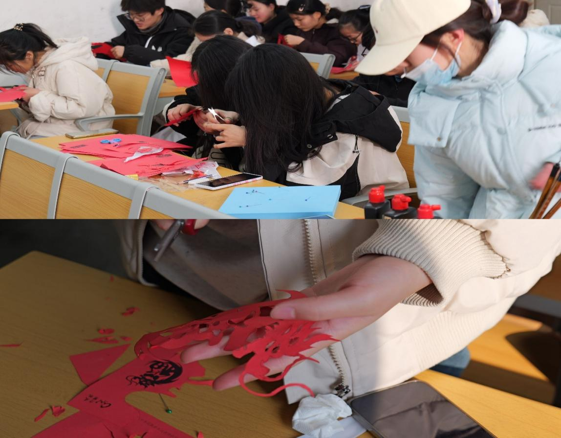 喜气洋洋迎新年,中国红是其中最亮丽的一抹色彩。一根红绳一编到尾,象征着人们对美好生活的祝愿。学而社康复之家社团举办编制中国结活动,同学们巧手翻飞,制作出的作品精致玲珑。绘声艺术团组织同学们在新年到来之前剪窗花、贴窗花,沉浸式体验中国剪纸文化。知书答影协会充分发挥同学们书法特长,开展“写春联、送福字”活动,在创作春联的过程中,同学们书写祝福,收获乐趣。