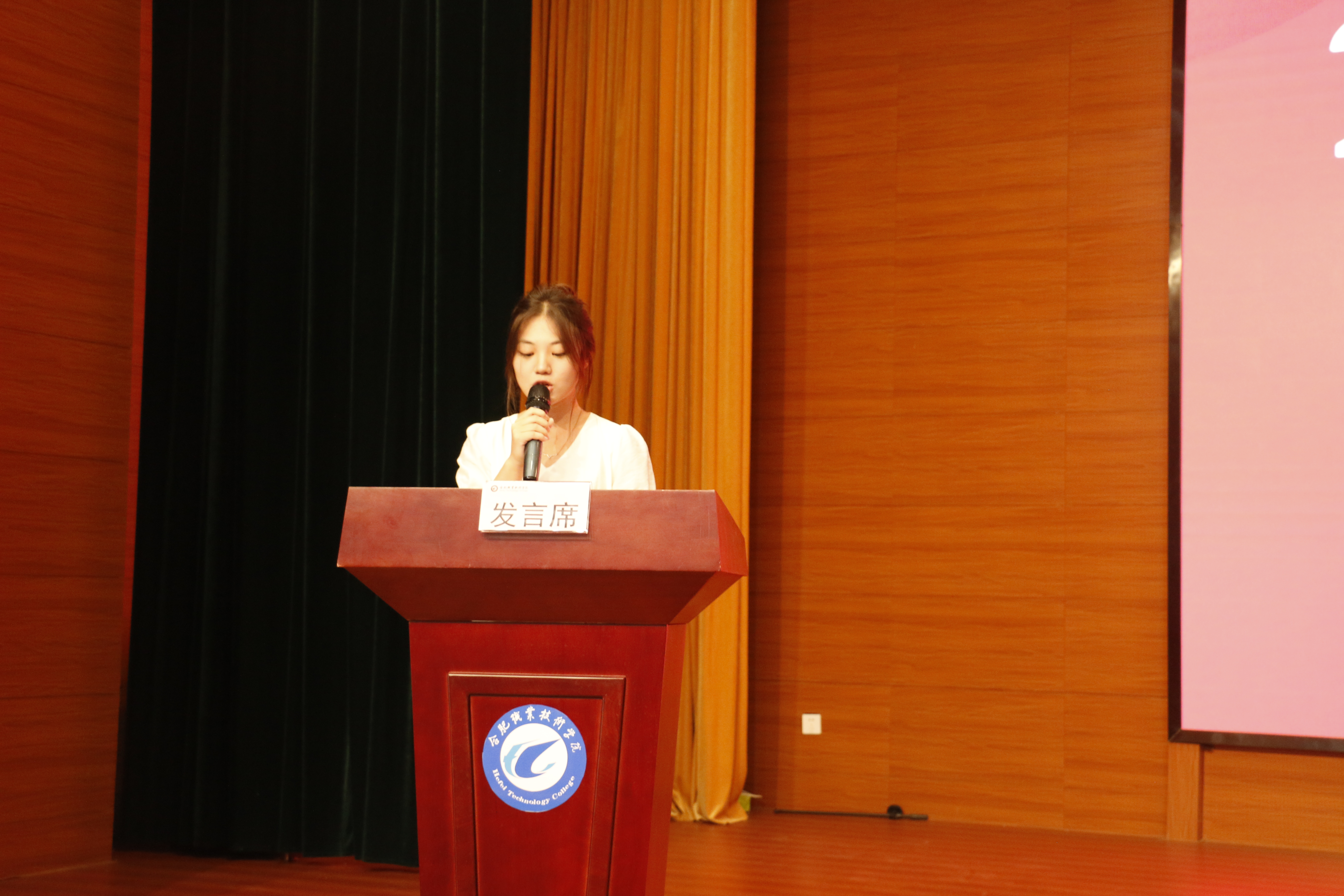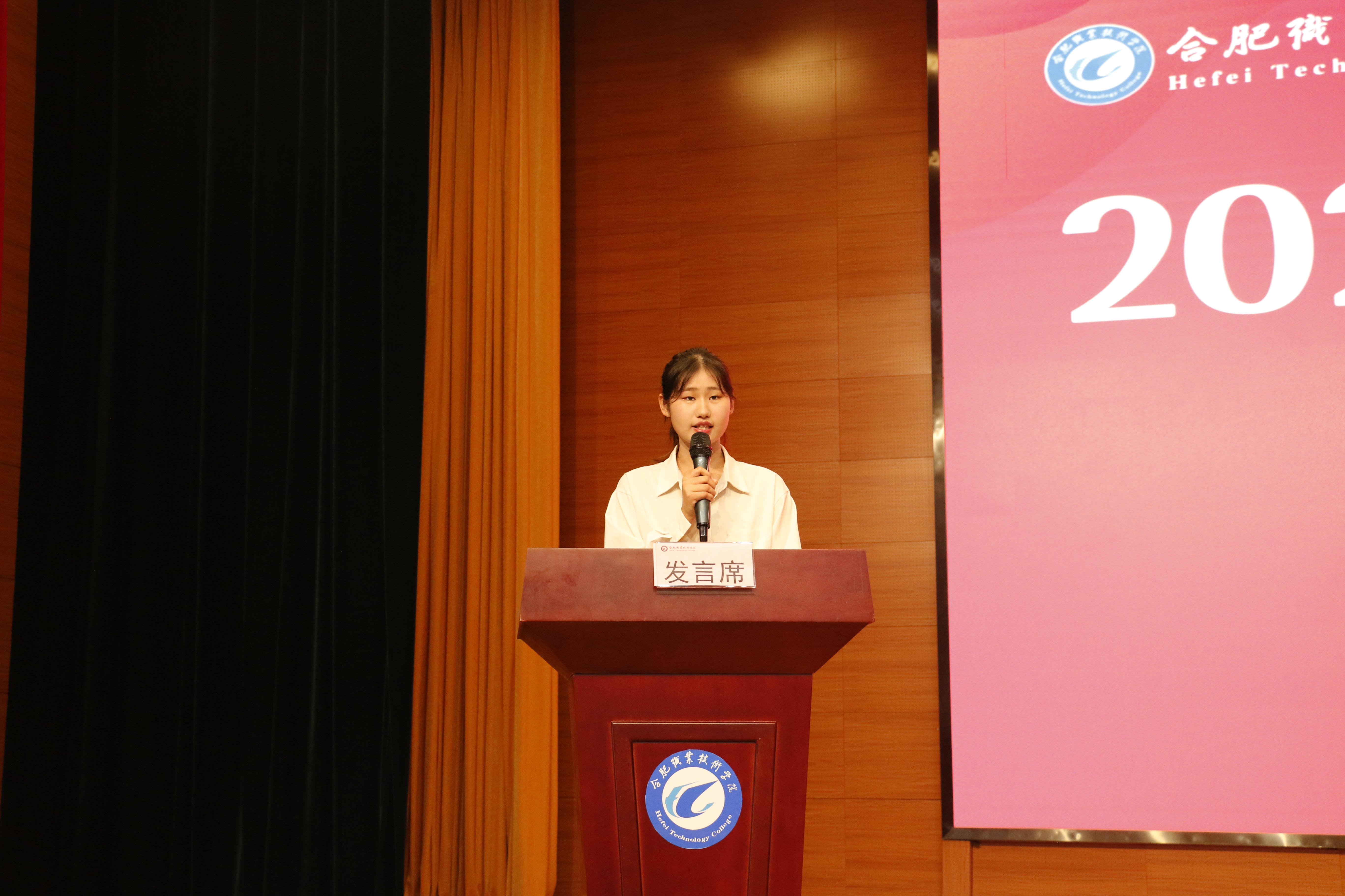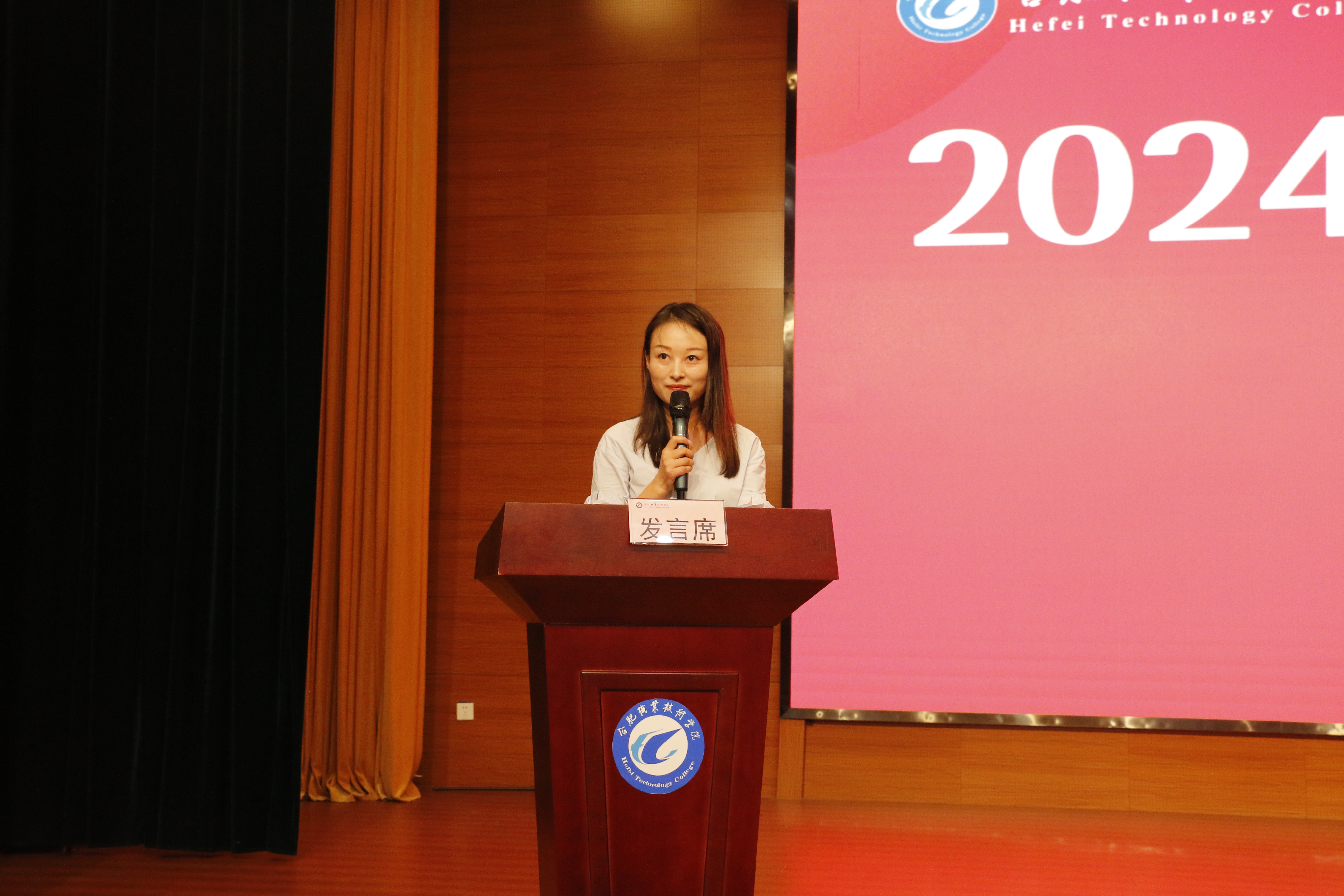 24康复1班赵家乐同学作为新生代表发言。她代表全体新生向为新生报到和入学教育辛苦工作的领导、老师和学长学姐们表达了衷心的感谢。随后,她分享了自己的所思所感,代表全体新生表态,努力做到以下三点:一是涵养高尚品德,做德才兼备的合职人;二是树立远大理想,做不懈奋斗的合职人;三是勇于挺膺担当,做爱校荣院的合职人。