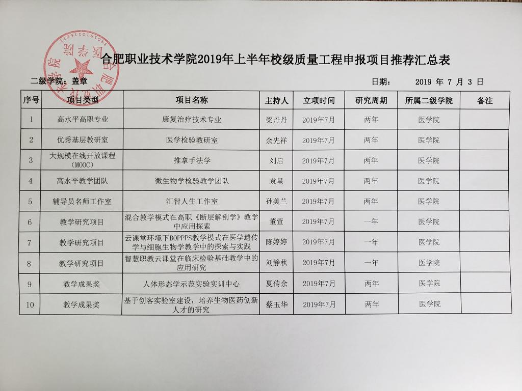 按照校质量工程管理办法,在线观看日本www一区于2019年7月2日召开质量工程申报项目评审会,现给予以下项目推荐申报,公示时间4天,截止至2019年7月6日公示结束,如有异议请与在线观看日本www一区教学管理办公室吕小明联系,电话055182394900。