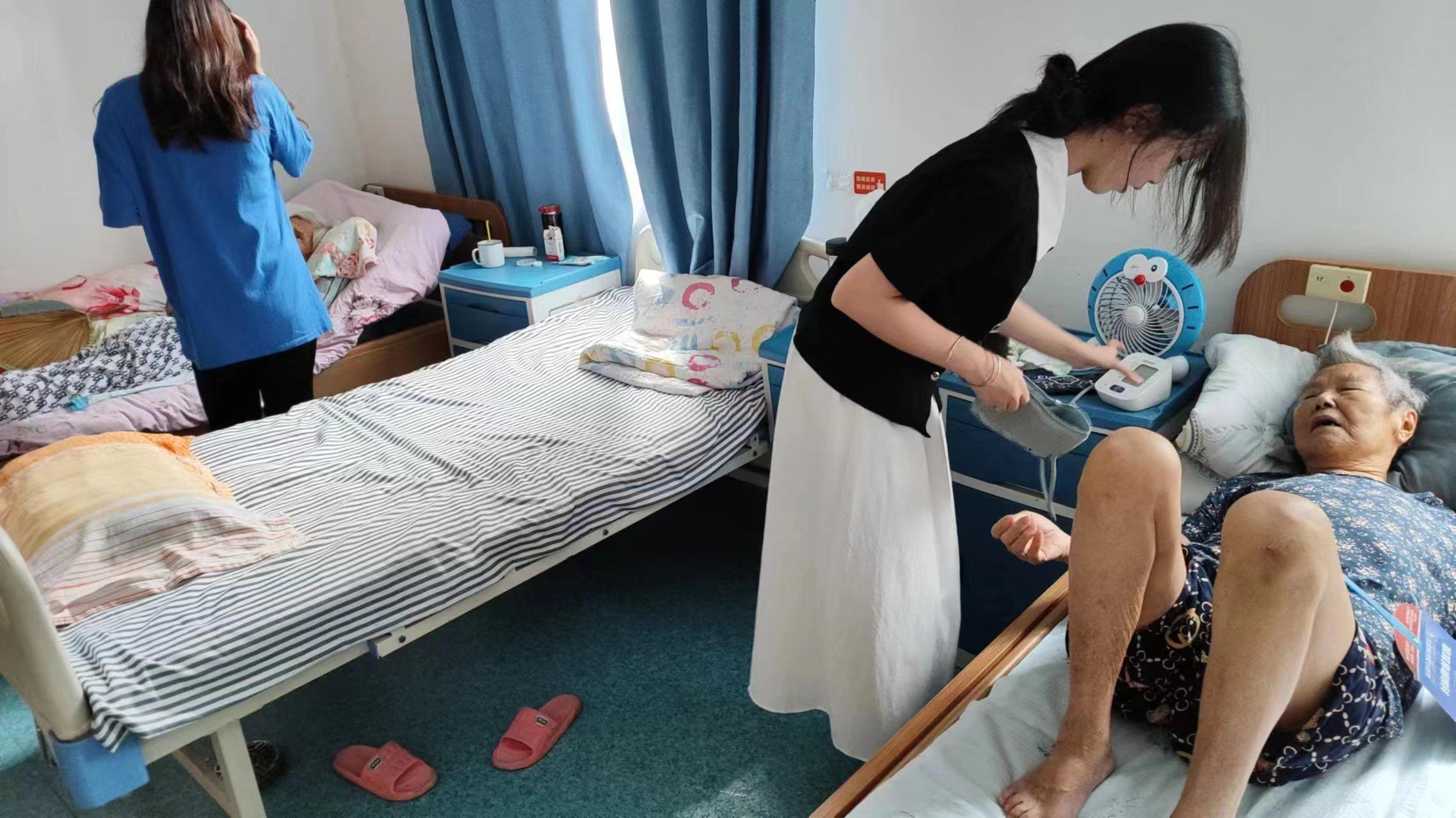 到达养老院,同学们刚好碰上了老人们的早操时间,几位同学快速融入进去,和他们一起唱歌谣,画面温馨,志愿者们受到了爷爷奶奶的热烈欢迎。早操结束后,同学们展开了清扫养老院、为老人测量血压等工作,同时向老人们和院方工作人员宣传相关的护理措施,嘱咐爷爷奶奶们爱护身体。