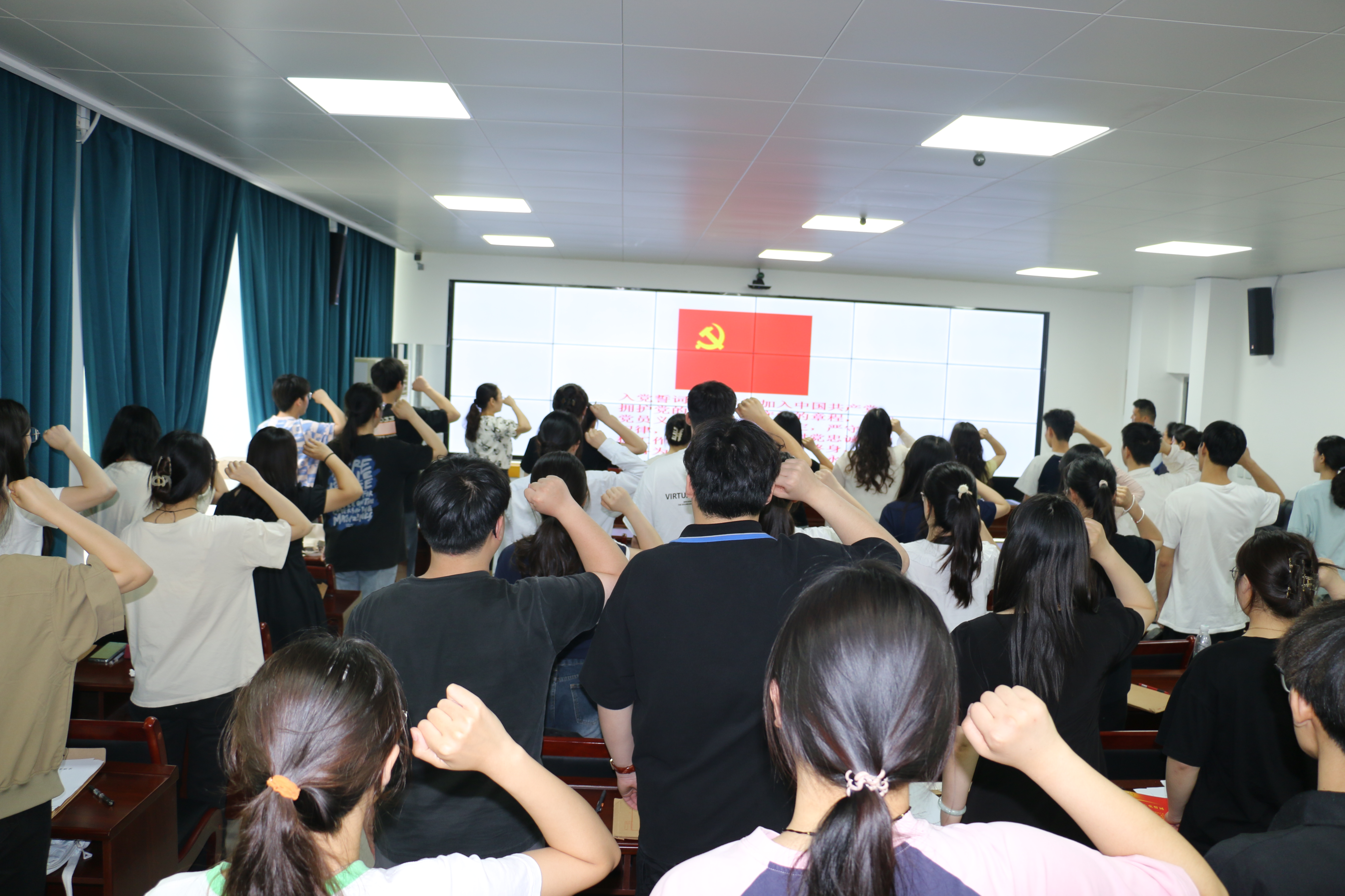 根据大会议程,首先由吴丙丁等41名发展对象分别向大会汇报个人对党的认识、入党动机,尤其是自列为积极分子后一年来的思想变化情况。随后,入党介绍人对每名发展对象在考察期内的培养及考察情况向大会作了介绍,并进行表态。各党支部组织委员分别介绍了41名发展对象的综合政审情况。经支部全体正式党员进行充分讨论,并以无记名投票方式进行表决,一致同意接收吴丙丁等41名发展对象为中共预备党员。会后,41名预备党员在刘惠老师带领下,面对党旗举行了庄严的宣誓仪式。