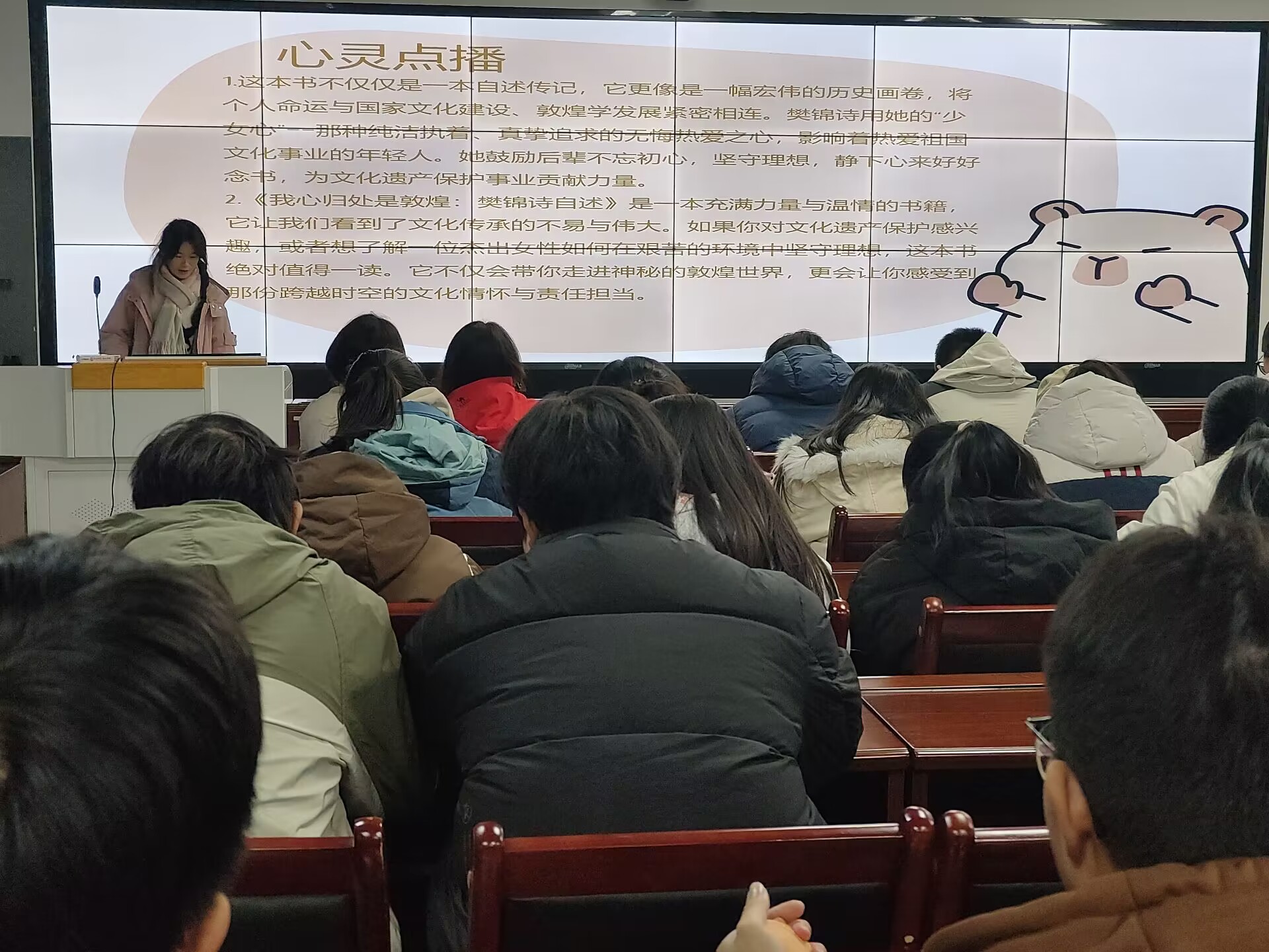 活动中,同学们依次上台展示自己所分享的书籍内容,同学们所选择的分享内容体现了他们对“廉洁文化”主题的思考。本次分享,有同学从历史角度出发,通过《中华廉洁文化史》《读懂百年党史》等揭示在当代了解中华廉洁文化的发展过程,目的在于将传统廉洁文化推陈出新,古为今用,赋予其鲜活的时代价值,为当代廉洁文化建设提供史鉴;有同学以中华传统审美艺术文化为切入点,通过《我心归处是敦煌:樊锦诗自述》展示“敦煌的女儿”樊锦诗五十多年坚守大漠、守护敦煌,积极开展国际合作,以高精科技向世界展现中国传统艺术之美的动人故事;还有同学分享《习近平的七年知青岁月》《红色延安的故事(清风廉洁篇)》《红旗渠精神》等书籍,展示中国共产党人在艰苦环境下的操守坚持。阅读这些书籍,给了同学们精神的滋养、心灵的洗礼和思想的升华,让同学们明白不论环境如何艰难,都要知廉洁之义,守廉洁之心,做廉洁之人,坚定理想信念,不惧诱惑挫折。